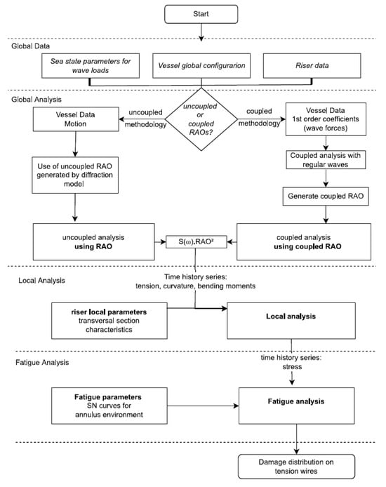 The remainder of this article is organized as follows. Initially, Section 2 describes the classical uncoupled methodology for the global analysis of FPSs and then outlines the primary concepts of coupled methodologies. Section 3 addresses the local analysis of flexible risers by revisiting a previously proposed approach to calculate fatigue damage in the tensile armors of these structures. Section 4 states the methodology proposed in this study, and Section 5 delineates the case study that illustrates the application of the coupled methodology for fatigue life calculation, taking an actual spread moored FPSO operating in a deepwater scenario. Finally, Section 6 discusses the results obtained, and Section 7 states the main conclusions of this study.