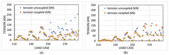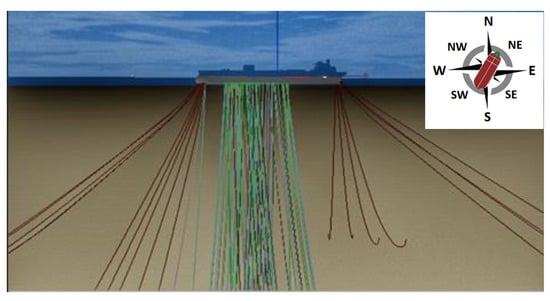 Considering the WkC formulation that has been described in Section 2.2, at a given time step of the algorithm that solves the hull motion equations Equation (4), one or more steps of the Newmark method to solve Equation (6) are performed independently for the FE model of each line, with the components of hull motion (obtained from the previous time step) prescribed at the top of the line, and under the action of environmental loadings. The results of these FE analyses are forces and moments at the top of all lines. In the next step, these forces are accumulated in vectors and at the right-hand side of Equation (4) and added to environmental forces due to wind, wave, and current acting on the hull. The computational implementation for each time step of the WkC scheme is detailed in [16].