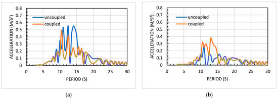This uncoupled approach has been widely used in extreme, fatigue, and interference analyses due to its easy implementation and low computational cost. It may give acceptable results for shallow water scenarios, where nonlinear restoring forces, damping, and inertia effects from mooring lines and risers have a minor influence on the vessel motions. However, it involves several simplifications, mainly disregarding the nonlinear interaction between vessels and lines. Refs. [18,19] have pointed out that the advance of offshore oil production towards ultra-deepwater scenarios would require more accurate design methodologies in which each component of a floating system (vessel, mooring lines, and risers) no longer can be considered separately but rather as a coupled system, confirming pioneering studies, such as those presented by [12,22]. That is, increasing water depth leads to increased contribution of the mass and damping of mooring lines and risers [17]. Hence, the system’s overall behavior is dictated not only by the hydrodynamic behavior of the hull but also by its interaction with the hydrodynamic–structural behavior of the lines.