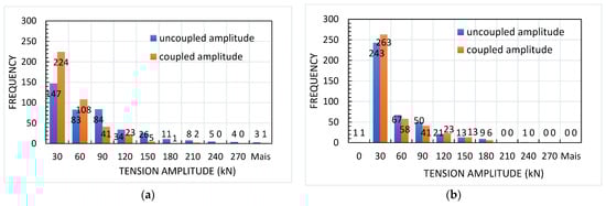 The present work proposes to take the next step towards a coupled dynamic analysis methodology, initiated by [15,16], but this time focusing on the fatigue context. Special attention is dedicated to applications on deepwater and ultra-deepwater scenarios involving FPSOs with numerous mooring lines and risers featuring a riser balcony on one side. For such applications, ref. [15] highlighted the substantial influence of nonlinear stiffness, inertia, and particularly damping effects from the lines on the hull dynamic behavior. Those studies have shown that the motions of the top connections of the risers are influenced by the coupling of the lines to the hull, resulting in asymmetric responses of vertical displacement in these top connections and an asymmetric response of the roll motion. These responses are due to the high number of lines in the riser balcony and the ultra-deepwater context, which increases the structures’ self-weight and damping. Moreover, this coupling effect gains prominence since coupled roll motion RAOs (Response Amplitude Operators) generated through time-domain coupled analyses using FE software exhibit notably lower energy content and asymmetry, which cannot be observed in traditional uncoupled analysis. Thus, as the roll motion is critical for the fatigue effects in the lines, together with the heave motions and tension, this work investigates the influence of the coupling of the roll and heave motions on the fatigue life of flexible risers in such deepwater scenarios.
