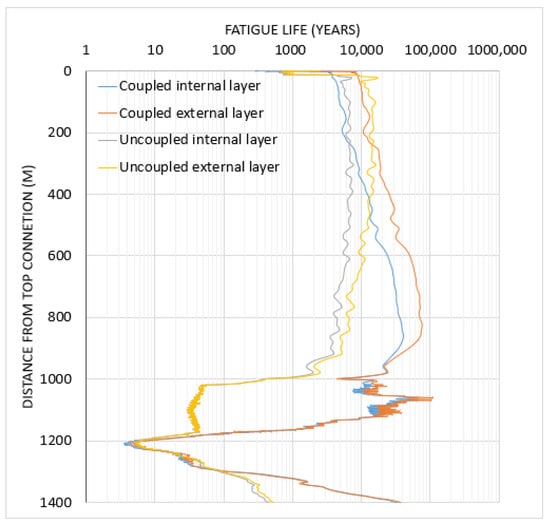 Another aspect addressed in this work is that, in general, coupled analysis studies have been conducted with a global approach, observing the hull behavior, global dynamic tensions, and moments on the lines. Now, having noted the asymmetric behavior of the FPSO with a riser balcony reported in the previous studies and considering the coupling of the hull with the mooring lines and risers, the objective here is to investigate the fatigue damage with local models that consider the different layers of the risers’ cross-section via coupled and uncoupled analyses. The goal is to demonstrate that the asymmetric behavior captured by the coupled analyses results in a different distribution of fatigue damage compared to the uncoupled methodology.