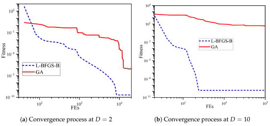 where . This function is a unimodal function with the global minimum located in a narrow parabolic valley. The function graph is shown in Figure 1. However, even if this valley is easy to find, converging to the minimum is very difficult. Let D represent the variable dimension; we tested the 2-dimensional and 10-dimensional Rosenbrock functions. All parameters of the Genetic Algorithm (GA) [18] and L-BFGS-B [19] are set to default values. The GA population size is 20 times the decision variable dimension, and the iterations are 500 generations. Therefore, the number of fitness evaluations (FEs) is . L-BFGS-B performs the same number of fitness value evaluations, and the iterative process of each algorithm is shown in Figure 2.