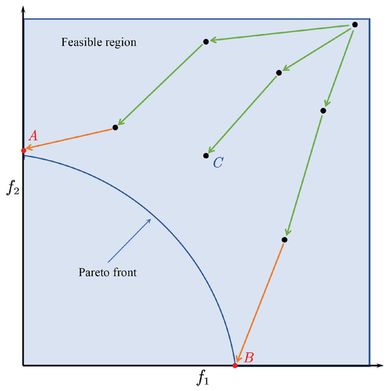 Although the GBA method has high optimization efficiency, it is easy to fall into local optimality; more seriously, when facing multi-objective optimization problems, the GBA will not evenly distribute the solution across the entire Pareto front. Especially, when the Pareto front is non-convex, the optimization results will move toward the extreme point. When the objective function is weighted and averaged with a set of randomly given static weight functions, the optimization results will move to points A or B [21], as shown in Figure 3. In addition, when the objective function is complex, the GBA method may fall into a local optimum, like point C. Our analysis believes this is due to the fact that the GBA method based on static weights has more than enough certainty in the search direction but insufficient randomness when solving multi-objective optimization problems. Therefore, this paper tries to introduce uncertainty into the determinism in order to improve this kind of problem—that is, the random weights are reassigned to each objective function at each iteration, which makes the solution spread in different directions at each iteration but at the cost of slightly reducing the convergence speed due to the continuous change in direction.