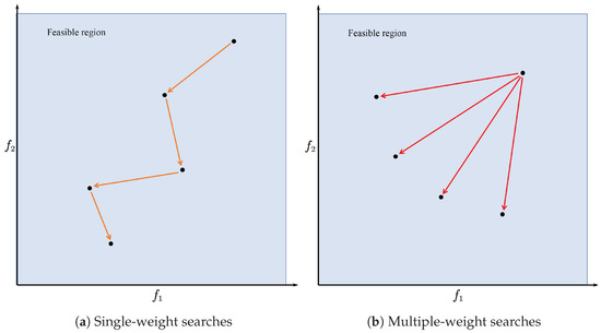In the single-weight mode, , in the multi-weight mode, —that is, in the single-weight mode, each individual corresponds to only one set of weights, and in the multi-weight mode, each individual corresponds to multiple sets of weights. Whether it is single-weight mode or multi-weight mode, each GBA optimization iteration regenerates a new random weight factor, which we call dynamic random weight factor. Figure 4 presents the search under single-weight and multi-weight modes. After that, each individual can be used as the initial value of the GBA. Gradient information can be obtained according to each objective function, and a local search can be performed to obtain the offspring population.