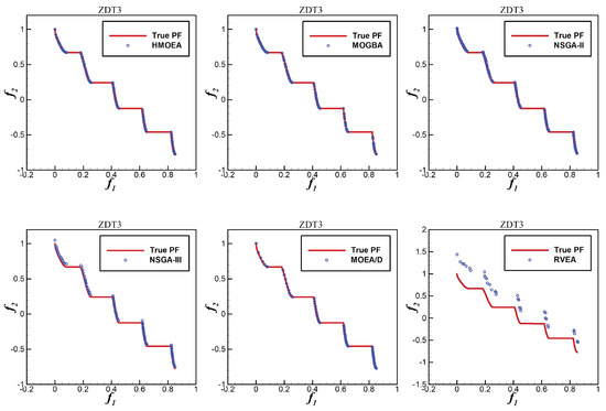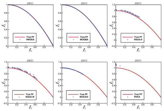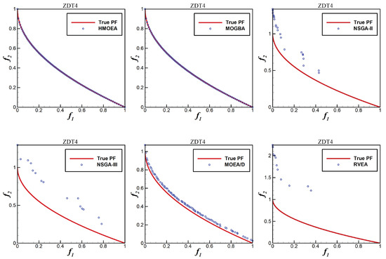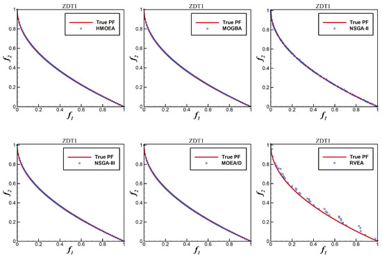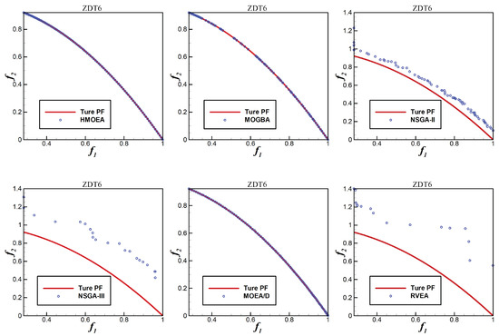 Figure 5, Figure 6, Figure 7, Figure 8 and Figure 9 show the distribution of non-dominated solutions obtained by the six algorithms on ZDT1–ZDT4 and ZDT6, respectively. As can be seen from these figures, MOGBA has a performance second only to HMOEA in ZDT1–ZDT4, which verifies our expectations for multi-objective gradient operators. For the ZDT6 function, MOGBA did not obtain a non-dominated solution with good distribution and its performance was not as good as HMOEA and MOEA/D. This may be due to the rapid loss of diversity caused by the local optimization characteristics of MOGBA when processing complex functions. Compared with other algorithms, HMOEA obtains non-dominated solutions with higher quality and more uniform distribution on the ZDT functions, which demonstrates the effectiveness of the hybrid strategy we proposed.