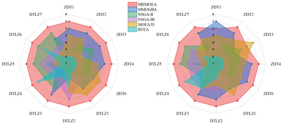 Algorithm’s metrics ranking for different test functions (left: rank of the IGD mean value; right: rank of the HV mean value).