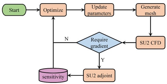 In each iteration, the optimizer first updates the design variables and then converts them into the coordinate points of the airfoil through a parametric method. Then, a structured mesh is generated, and finally, the optimizer launches the flow field solver to evaluate the objective function. If necessary, it will drive the adjoint solver to obtain gradient information.
