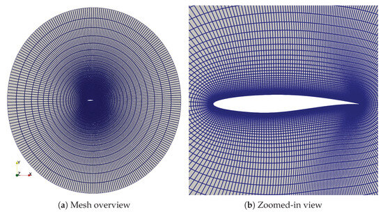 where and are the lift and drag coefficients in the two states, respectively. The subscript represents the baseline airfoil RAE2822. The parameterization method adopts the CST method described in Section 5.2. The turbulence model uses , and the spatial discretization uses Roe scheme. Figure 12 shows a global and local zoomed-in view of the structured mesh used.