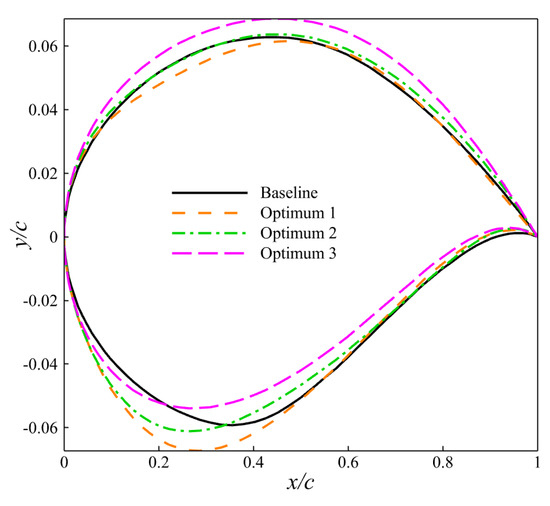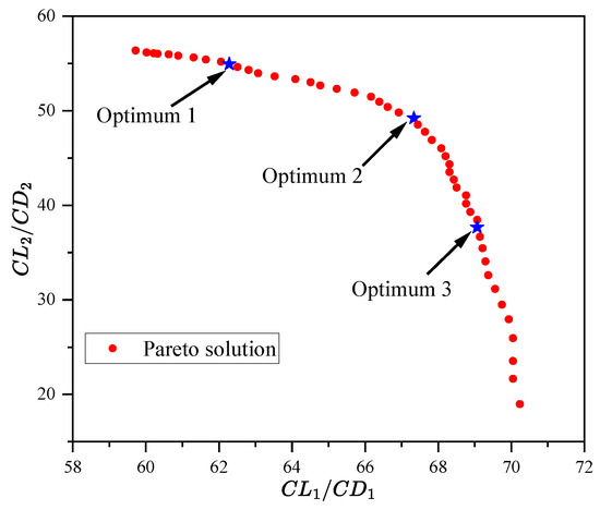 We give a series of Pareto-optimal solutions. For different Pareto-optimal solutions, the aerodynamic characteristics of the optimized airfoil in the two states also have different performances. Therefore, the Pareto-optimal solution suitable for specific problems can be selected according to needs.