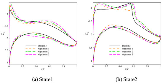 Figure 15 shows the geometric shape comparison of the airfoil before and after optimization, and Figure 16 shows the comparison of pressure coefficient distribution before and after optimization. For state 1, the improvement in lift–drag ratio of the three optimized airfoils mainly comes from the increase in lift. For state 2, the lift of the three optimized airfoils increased slightly. The shock wave of optimized airfoil 1 was largely erased. The shock wave of optimized airfoil 2 was slightly weakened. The shock wave intensity of optimized airfoil 3 remained almost unchanged. In other words, for optimized airfoil 1 and optimized airfoil 2, the improvement in lift–drag ratio mainly comes from the reduction in drag caused by the weakening of shock waves and the increase in lift. It is possible that the lift–drag ratio of optimized airfoil 3 remained almost unchanged due to the simultaneous increases in lift and drag.