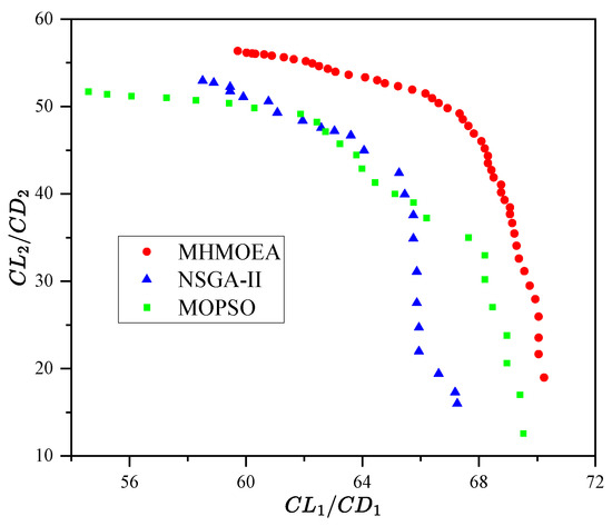 As can be seen from Figure 17, with the same number of fitness value evaluations, the distribution and convergence of the Pareto-optimal solution obtained by HMOEA are significantly better than NSGA-II and MOPSO. It can be seen that for aerodynamic optimization problems, HMOEA is obviously a more efficient algorithm. It can obtain a more ideal Pareto-optimal set with fewer flow field calculations, which greatly improves the efficiency of aerodynamic optimization.