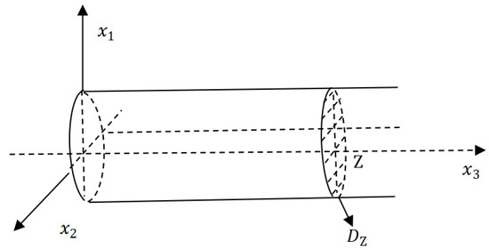 The first purpose of the present paper is to study the spatial decay results of the solutions to Equations (1)–(4) when . In fact, Keiller [4] studied the spatial decay of steady perturbations of plane Poiseuille flow for the Oldroyd-B equations as . For such a type of study, one can also see [5]. After the earlier work of Boley [6], the spatial decay results of fluid equations with spatial variables in a cylinder, which can be thought of as decay results of the Saint-Venant type, have been paid full attention. For more of such Saint-Venant type results, one can see [7,8,9,10,11,12,13,14,15,16]. Compared with references [4,5], the innovation of this paper is the use of the methods of references [9,11] to further extend the attenuation results to a semi-infinite cylinder. We demonstrate that the solution decays exponentially on the semi-infinite cylinder, indicating that the velocity and viscoelastic variables of the fluid decay exponentially with distance from the finite end to the infinite. This is the first result that we establish in the present paper.