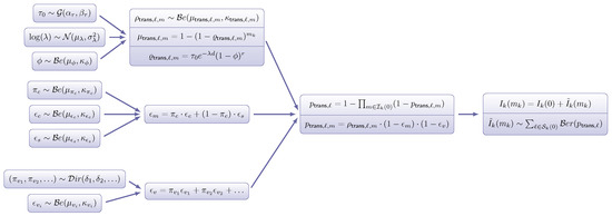 Therefore, we model the probability of being infected as . However, our goal is not only to account for the uncertainty associated with but also to reflect the fact that its expected value may vary according to a specific functional form determined by various parameters, which may themselves be regarded as random variables. In this case, the expected value would no longer be deterministic, and we would need to use a composition method to sample from it. Specifically, we assume the following model, proposed in [14]: