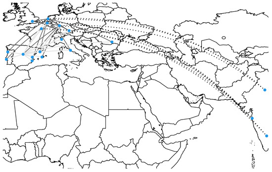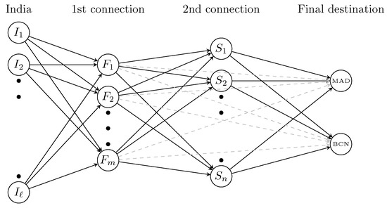 For practical purposes, in our study, we only consider those routes that connect one airport in with one airport in within the same day after, at most, two stopovers. To that end, we define as the sets of airports corresponding to the first or second stopover, respectively. Once the set of suitable routes (potentially carrying infected passengers to the target airports) has been identified, we are further interested in determining which routes or intermediate airports could pose higher risks as potential vectors for the transmission of the infectious disease.