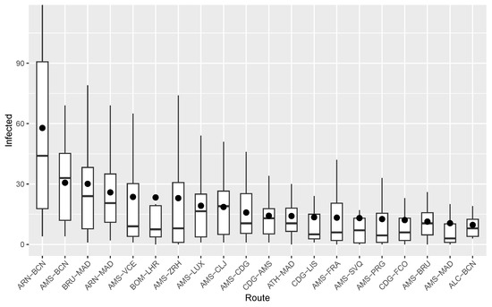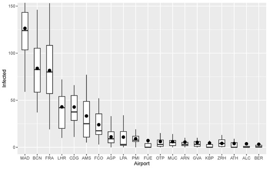 We now identify those airports/routes with the most infected passengers in the previous simulation in Section 5.1. Apart from MAD and BCN, the airports receiving the largest numbers of infected passengers during the 2-month period are displayed in Figure 8, where we show boxplots for the different airports, ordered in decreasing order of their mean value (indicated with a black circle). As we can observe, some of the most important European airports act as major distribution centers in the sense that they receive/send significant numbers of infected passengers from/to other airports in the network.