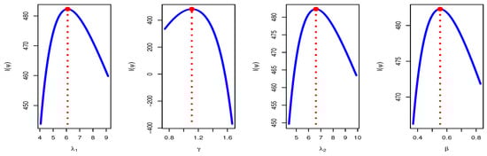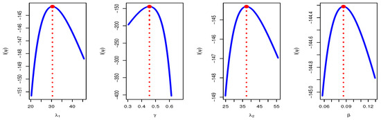 Likelihood profile (blue line) for parameters of PR based on SSLT under TRV model with the maximum likelihood estimation (red dot): electrical appliances data.