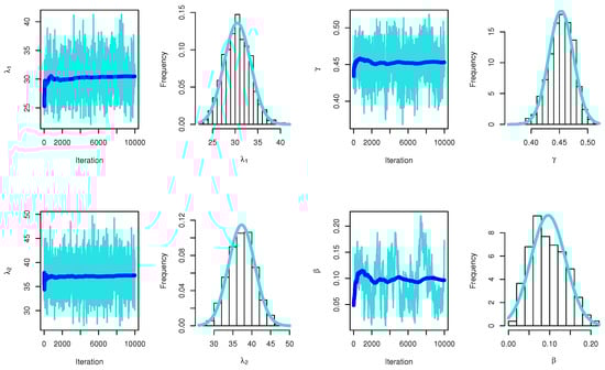 Since the Equations (16)–(19) cannot be computed explicitly, numerical techniques are employed. One of the most powerful numerical techniques in Bayesian estimation is the Monte Carlo Markov Chain method (MCMC). In this scenario, we suggest employing the Metropolis–Hastings (M-H) sampling method within the Gibbs algorithm, utilizing a normal proposal distribution as recommended by Tierney []. The procedure for Gibbs sampling incorporating the (M-H) approach is outlined as follows: