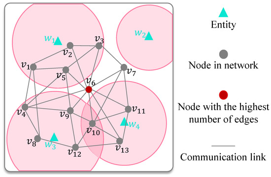 As shown in Figure 2, there is a complex network composed of thirteen nodes. The attacker has deployed four entities around the network. Each entity has its attack range, which is illustrated by the light blue circle. It is easy to find that node can be attacked by , can be attacked by , and can be attacked by . Additionally, each entity has different abilities to produce harm, and each node in the network has different removal thresholds. Without loss of generality, the attack abilities of are , respectively. The removal thresholds of are , respectively.