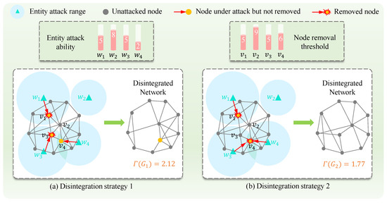 Two different disintegration strategies. (a) Three entities attack three network nodes, only two of which can be removed. The network performance after disintegration is 2.12. (b) Three entities attack and remove two network nodes. The network performance after disintegration is 1.77.