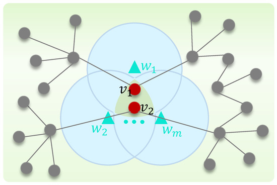 Assuming that there is a subset sum instance, e.g., , we could construct an instance of the network disintegration problem from this subset sum problem instance. As shown in Figure 3, there is a network with two crucial nodes . There are also m entities deployed near , and their attack abilities are , respectively. Additionally, we assume that the removal thresholds of both and are . Without loss of generality, we assume that only and lie in the attack range of all entities.