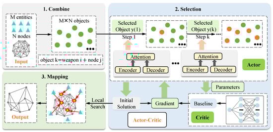 In the selection stage, we use an encoder–decoder neural network with an attention mechanism to output the optimal solution. Specifically, we initially employ the encoder to extract features from all objects and generate their embeddings (high-dimensional vectors). Subsequently, these embeddings are fed into the decoding neural network for decoding purposes. The decoding process primarily involves selecting an optimal subset of objects from a pool of candidate objects. At each decoding step, we use the decoding neural network in combination with the attention computation method to calculate the attention value of all unselected objects. The agent then greedily selects the object with the highest attention value. Once an object is chosen, it is removed from the candidate object set. This aforementioned decoding process is iteratively repeated until either the maximum constraint on entity attack ability is reached or until the maximum number of steps is exhausted. The structure of the neural network will be illustrated in detail in Section 4.2, and the training process of the neural network parameters will be described in Section 4.3.