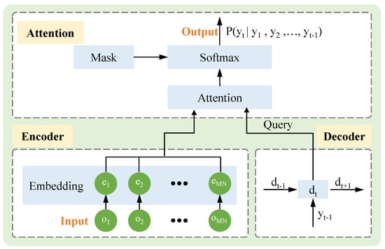 As the output dimension is dynamically determined based on the input vector’s dimension, it is necessary to adjust the dimensions of the output accordingly. The conventional Seq2Seq model lacks flexibility and cannot address this dynamic output dimension problem. Fortunately, Vinyals et al. [39] introduced the attention mechanism into the Seq2Seq model, yielding promising results. Therefore, we also incorporate the attention mechanism into our neural network architecture to tackle this problem. As depicted in Equation (10), at step t, we compute a weighted sum of the decoded hidden layer state and the embedding vector , which is subsequently passed through the tanh activation function.
