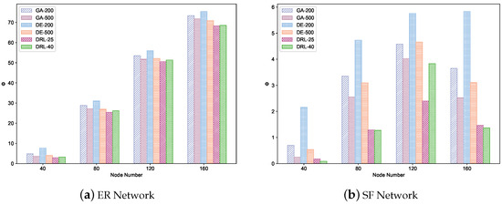 As shown in Figure 7, the quality of the solutions generated by the Net-Cracker is superior to those generated by the benchmark method in both the ER and SF networks. Specifically, for the ER network, regardless of the size of the problem instance, the average disintegration effect of the DRL-25 algorithm is slightly better than that of the other algorithms. Compared to the heuristic algorithms, the accuracy of the Net-Cracker can be increased by about 8∼10%. For the SF network, when the problem size is 40, 80 and 160, the disintegration performance of DRL-40 is significantly better than GA and DE. At the same time, when the problem size is 120, the solution quality of the DRL-25 algorithm is also superior to GA and DE. The accuracy of the Net-Cracker can be improved by about 50∼62%, indicating that the Net-Cracker is more aggressive in disintegrating the SF network.
