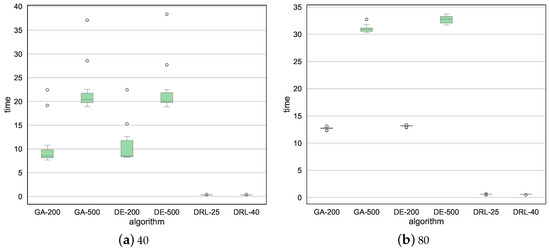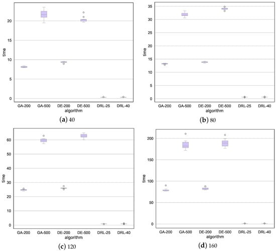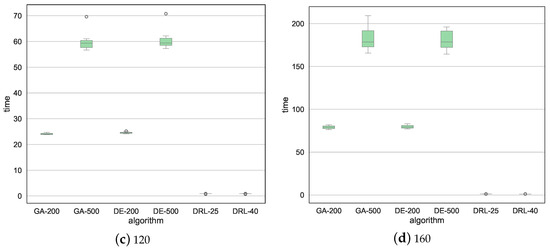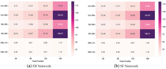 We draw the box plots of the solution times of different algorithms when faced with instances of disintegration problems in ER and SF networks, as presented in Figure 8 and Figure 9, respectively. We can see that Net-Cracker can find the solution faster than other benchmark methods, regardless of the problem size of the synthetic network instance. In addition, to further analyze the correlation between the solving speed of the algorithm and the scale of network disintegration problems, we draw a heat map of the average solution time, as shown in Figure 10. As the problem size increases, we can see that the solution time of GA and DE algorithms significantly increases. In particular, GA-500 and DE-500, when dealing with the same problem instances, have significantly better solution quality than GA-200 and DE-200, respectively, but the solution time is more than twice that of GA-200 and DE-200. In contrast, the DRL algorithm can find the solution within 2 s when facing different scale problems, and the solution time fluctuates less.