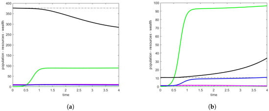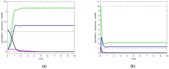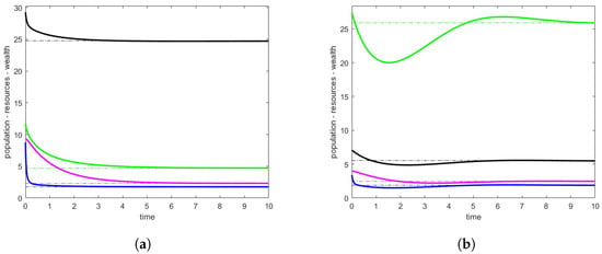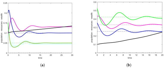In all depicted graphs, the evolution of variables is illustrated using distinct colors: the population in magenta, renewable resources in green, non-renewable resources in black, and accumulated wealth in blue. Dashed lines indicate the coordinates of the equilibrium point under consideration, with matching colors for corresponding components (i.e., magenta for the population, and so forth).
