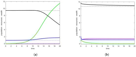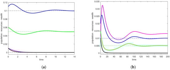 The replenishment term is obtained from a function which, in population dynamics, is a Holling II-type function (see [], p. 25 and passim), used to model saturation effects. The equation above states that the replenishment is possible but cannot be above a level k, and we can call this an hypothesis of “moderate optimism”. Another characteristic of [] is that we dropped the distinction between Commoner and Elite, so we obtained a model with four variables, which are population, renewable and non-renewable resources, wealth. In [], we obtained all the critical points of the system, and we studied their stability. In the final section of [], numerical simulations support the theoretical results and also suggest the possibility, not yet treated in a rigorous way, of periodic orbits and chaotic dynamics.