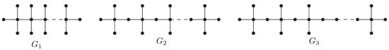 - If then there must be a vertex, say , of degree two laying on an external path of where , , and . Since , has another branching vertex, say (), which forms an internal path in the graph . Let be the neighbor of that lies on the path (the vertex may coincide with ).Now, we consider a tree that can be found in the class and is obtained from by the following operation:There exists a positive real number such that these two graphs satisfy the following:Since and , Equation (1) yields , a contradiction.