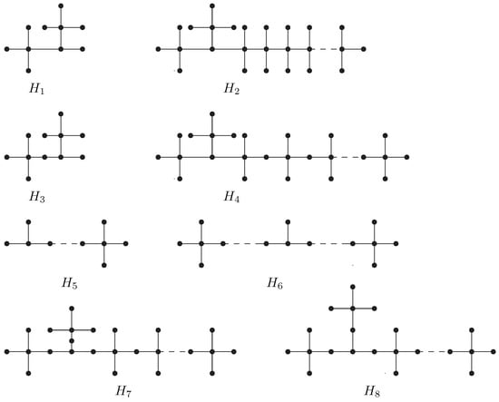 Thus, by Lemma 1, all possible non-zero values of are as follows (for example, may be a graph constructed from (shown in Figure 4) by inserting a vertex of degree 2 on each of its internal path(s) of the form ):