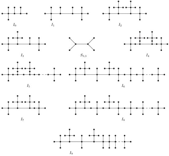 If then, by Lemma 1, is the graph depicted in Figure 3. If then, again by Lemma 1, is the graph constructed from by inserting a vertex of degree 2 on its unique internal path of length 1. Thus, all possible non-zero values of are given as follows: