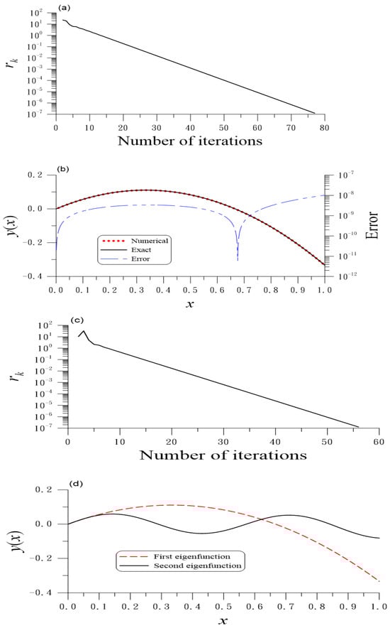 No closed-form eigenfunction exists for this spectral problem. We take , 10,000, and , and iteratively determine by Equation (30) as shown in Table 2.