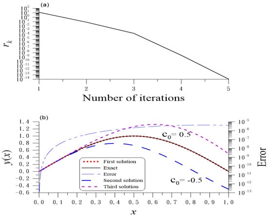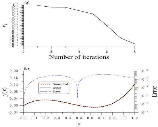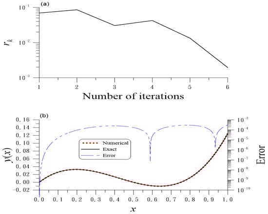 We first consider . We can derive , and take for comparing the computed to the exact one . We take , , , , and . Figure 3a shows five iterations for the convergence; Figure 3b reveals high accuracy with ME = , AE, and .