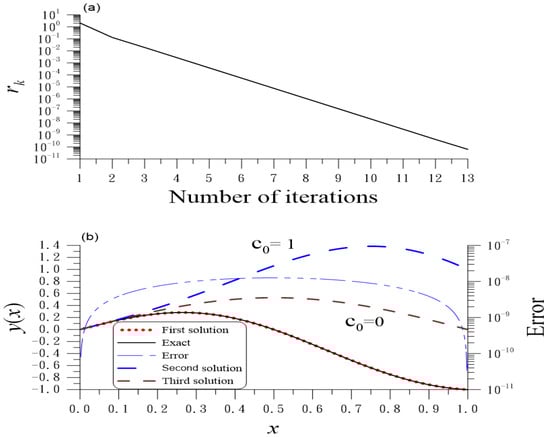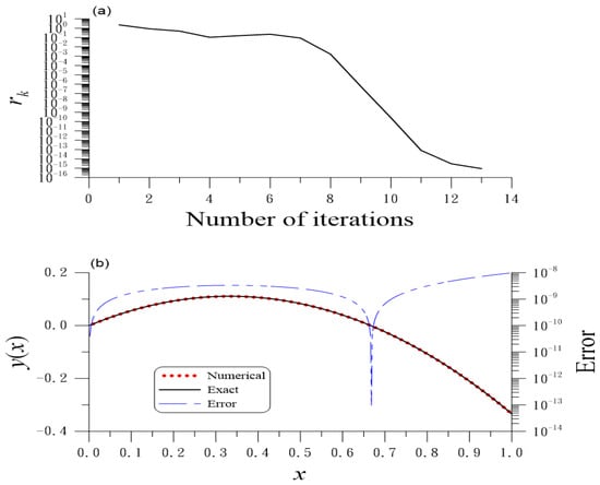 We take and . Figure 6a shows 13 iterations, which converge faster than 77 iterations in Section 5.4. Figure 6b reveals a high accuracy with ME = AE, and .