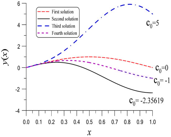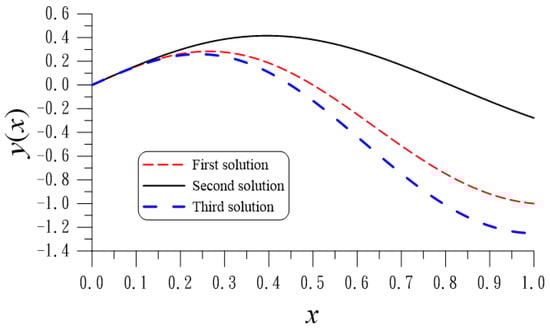 For this example, we also find other solutions, as shown in Figure 5 by a solid line, which is different from the first solution as shown by a thin dashed line in Figure 5. Although these two solutions have the same values of and , the ended values are −1 and −0.2781268005, respectively. However, we do not have an analytic form of the second solution.