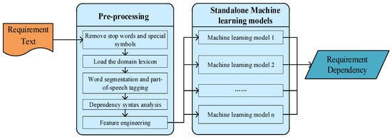 Currently, machine learning has been widely applied in various stages of software engineering. By using machine learning, we can solve the problems of incomplete modelling and algorithm defects encountered in software development [10,11]. Machine learning can also perform data analysis tasks in software engineering, such as small dataset engineering problems [12], software requirements and code review problems [13,14,15]. Another important role of machine learning is to reduce manual workloads in software engineering tasks [16,17,18,19,20], such as defect prediction, code suggestions, automatic program repair, feature localization and malware detection. Machine learning has also been widely applied in cost prediction, software testing and software quality assessment in the software development process, such as in consistency research between developers and tasks [21], integration testing [22], software development cost prediction [23] and software quality assessment [24]. Meanwhile, requirements engineering has also applied a large number of machine learning methods [25,26,27,28,29,30,31,32,33,34,35,36,37,38,39], such as requirement acquisition, requirement formalization, requirement classification, the identification of software vulnerabilities from requirement specifications, requirement prioritization, requirement dependency extraction and requirement management. Previous studies have demonstrated that the automatic extraction of requirement dependency relationships is a feasible and effective task [32,33,34,35,36,37,38]. However, dependency relation extraction based on traditional machine learning suffers from issues such as feature singularity and low adaptability, making it difficult to represent the informational value of requirements from multiple perspectives. Additionally, when selecting prediction models, standalone machine learning models are often utilized. The performance of these models is constrained by their inherent algorithms and parameter settings, limiting their ability to fully leverage the features of requirement pairs, and thus leading to performance bottlenecks.
