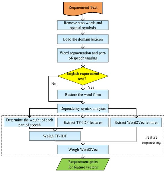 The pre-processing flow of the requirement text is shown in Figure 2. If it is a Chinese requirement text, the JIEBA participle tool is used to participle the requirement sentence Rx. Domain lexicons are introduced to correct the errors in participle and part-of-speech tagging. The Language Technology Platform (LTP) is used to perform the dependency syntax analysis of the requirement sentence. In the case of an English requirement text, the NLTK tool is used for word segmentation, part-of-speech tagging, and word form reduction. StanfordNLP is used for dependency syntax analysis. The subject-predicate-object triplets are extracted in the dependency syntax analysis, which correspond to three parts of speech, which are the subject noun, predicate verb, and object noun, respectively. Corresponding weights are assigned to each part of speech, and they use its feature for weighing TF-IDF. The improved TF-IDF with Word2Vec are integrated to generate feature vectors for requirement pairs. Since the requirement text is often an elaboration of specific requirements in a domain, there will be wrong division when dividing the words and part-of-speech tagging of domain-specific vocabulary. For example, in the requirement sentence {The teaching assistants can assist students in complete projects in the system} in the Course Management System [49], the word “complete projects” is labelled as a gerund structure, whereas it should be a verb structure in this requirement domain. Therefore, in this paper, a lexicon module for the specific requirement domain will be added to the process of requirement analysing in the dependency syntax to correct the misclassified participle and part-of-speech-tagging results, and, thus, greatly improve the accuracy of requirement dependency extraction. The domain lexicon based on the requirement text of the course management system mainly includes the login password (n), completing projects (v), answering questions (v), the teaching assistant (n), and group members exchanging groups (n).