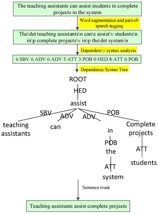 When the requirement text is represented in Chinese, we select the LTP natural language technology open-source platform (https://cloud.itp.ac.cn, accessed on 27 October 2023) of the Harbin Institute of Technology as the tool for dependency syntax analysis. The tool integrates the Chinese natural language analysis module to include vocabulary, grammar, semantics and the other five natural language processing core technologies. Through the API web service provided by the platform, the tool can effectively improve the performance of text analysis. A dependency grammar tree is a visual representation of dependency grammar analysis, which analyses the dependency between words for each requirement sentence and selects the central verb of the sentence as the root node of the syntax tree. Due to the existence of dependency type division between nodes, it is more suitable for keyword extraction to formalize the requirement.