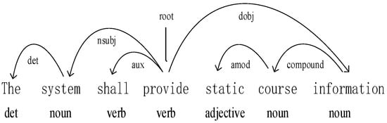 When the requirement text is an English requirement text, StandfordNLP is used as a dependency syntax analysis tool. StandfordNLP is a deep-learning-based natural language processing tool developed by Stanford University. When performing text processing, StandfordNLP divides the text into basic units such as words, roots and morphemes, and analyses the semantic and syntax relationships between them using neural network algorithms, so as to construct a dependency tree and extract the relationships in it. As shown in Figure 4, in English requirement sentence R4 {The system shall provide static course information}, its participle result is {The, system, shall, provide, static, course, information}, and its part-of-speech tagging result is {\det, \noun, \verb, \verb, \adjective, \noun, \noun}, the analysis result of dependency syntax is {2:det 4:nsubj 4:aux 0:root 7:amod 7:compound 4:dobj}, and by using dependency syntax, the main backbone of the requirement sentence can be extracted, which is the subject-predicate-object triplet {system, provide, information}. The dependency syntax analysis for the requirement sentence R5 {The system shall allow students to customize the notification behaviour} is shown in Figure 5, and the participle results are {The, system, shall, allow, students, to, customize, the, notification, behaviour}, the part-of-speech tagging result is {\det, \noun, \verb, \verb, \noun, \part, \verb, \det, \noun, \noun}, and the dependency syntax analysis result is {2:det 4:nsubj 4:aux 0:root 4:dobj 7:mark 4:xcomp 10:det 10:compound 7:obj}. The original extracted requirement sentence backbone is the subject-predicate-object triad {system, allow, students}, but this requirement sentence’s backbone cannot reflect the information contained in the requirement sentence. Therefore, in this paper, the extraction method of the requirement sentence’s backbone is improved. If the direct object of the requirement sentence is a noun such as “students”, “collectors”, “administration”, “individuals” and so on, and affiliates an object complement, then the logical subject acts as the subject noun, the verb in the object complement acts as the predicate verb, and the object acts as the object noun. The improved method extracts the requirement sentence’s backbone as {students, customize, notification behaviour}.
