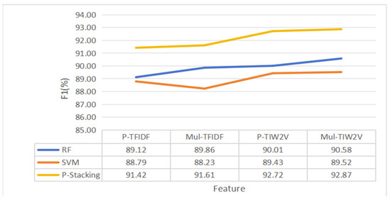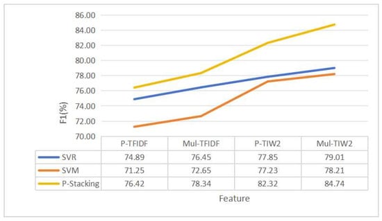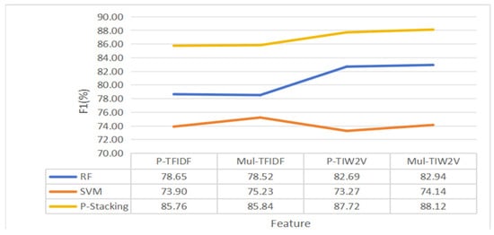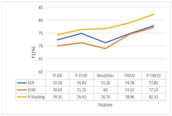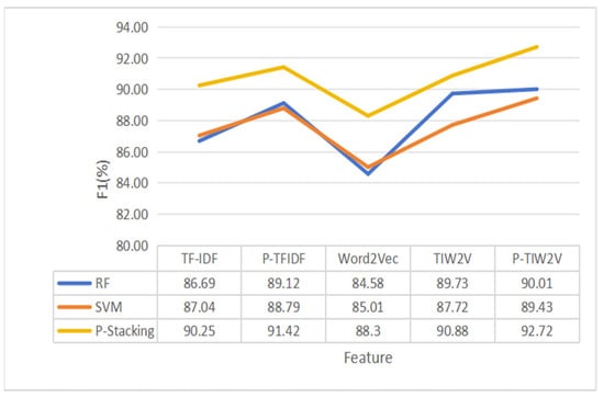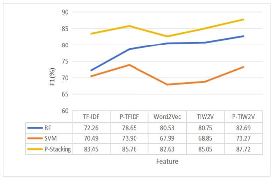 The experimental results indicate that the part-of-speech feature extraction method and feature fusion method proposed in this paper can significantly improve the prediction performance of a standalone machine learning model. Compared with the method based on single features, the F1 score of each standalone machine learning model is significantly increased after the gradual fusion of part-of-speech features, TF-IDF features and Word2Verc features. In addition, after optimizing the part-of-speech feature extraction method, the F1 score of the machine learning model based on multiple part-of-speech weight features is also improved to a certain extent.