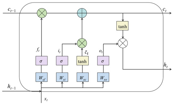 Long Short-Term Memory networks (LSTM) [36] were introduced to overcome the rapidly vanishing gradient problem encountered in training Recurrent Neural Networks (RNN) with gradient descent methods. This phenomenon occurs during the backward propagation of gradients along the sequence. As shown in Figure 1, the LSTM cell contains three gates: input gate, forget gate and output gate [37]. is cellular memory at time t − 1, is cellular memory at time t, is hidden layer information at time t − 1, is hidden layer information at time t, is input at time t, is input gate output, is forget gate output, is output gate output, is candidate value vector, and are activation functions and , , , represent corresponding weight factor matrices.