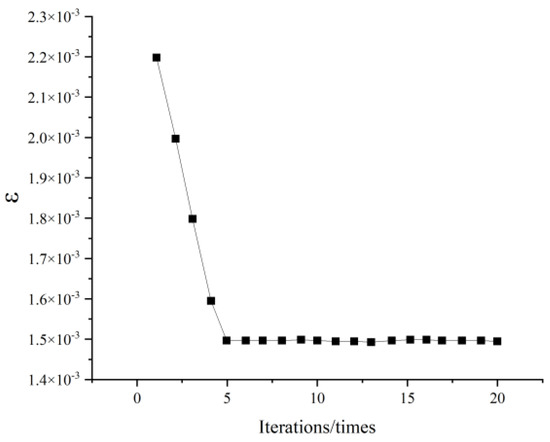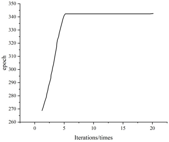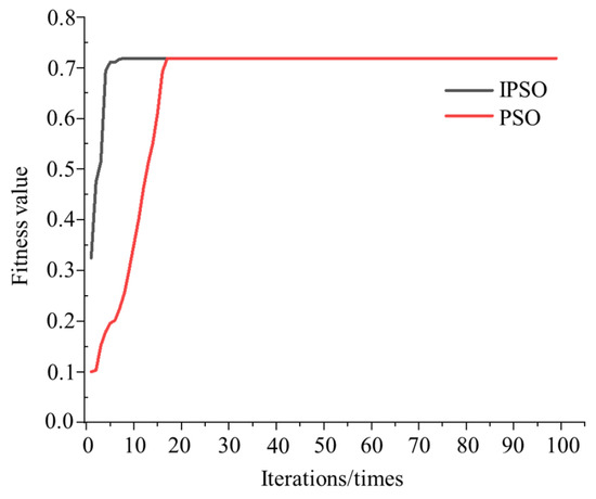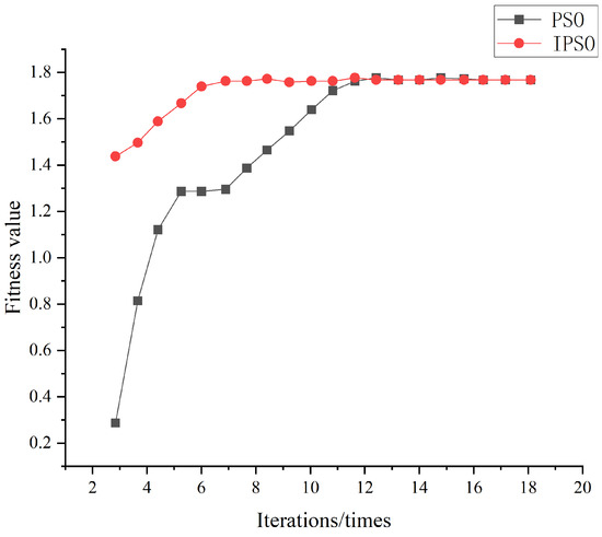 When , use Equation (3) to calculate the fitness value. When and are not 0, use Equation (4) to calculate the fitness value. The parameters related to IPSO and PSO are the following: the weights of IPSO are , , the weight of PSO is 0.6 and the other parameters are consistent. After several calculations, take the mean value; the final result is shown in Figure 2.
