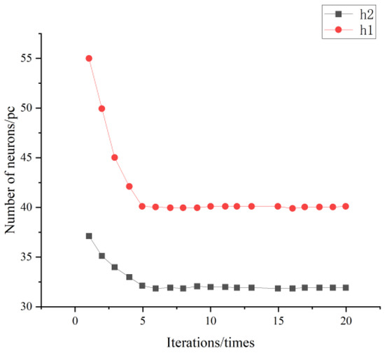 The results are shown in Figure 5. The results of PSO and IPSO are obtained by averaging 10 computations each. The IPSO method is used to optimize the number of neurons in each hidden layer, the network learning rate and the number of training iterations, with the algorithm settings being the same as before. The changes in the number of neurons in each hidden layer of the LSTM network model are shown in Figure 6. As can be seen from the figure, the number of neurons in the first hidden layer finally stabilizes at 40, and the number of neurons in the second hidden layer stabilizes at 32.