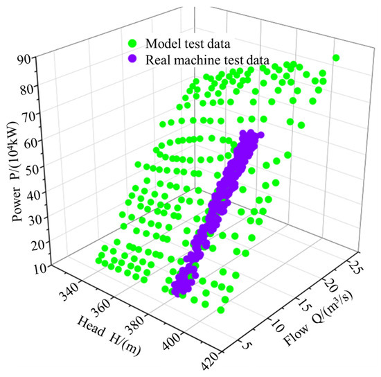 The model experimental data and the actual operation data are shown in Figure 10. It can be clearly observed that the distribution of the actual operation data is relatively concentrated, which is consistent with the actual situation of the unit operating in economic zones. The model data are under full-head conditions and are relatively comprehensive. By using the comprehensiveness of the model data and the specificity of the actual operation data, a training dataset for the network model is constructed. This approach effectively considers the full-head operating conditions of the units and comprehensively integrates the high-efficiency operating zones during actual operation, thus avoiding the issues of accuracy and precision that arise from training networks with a single data source.
