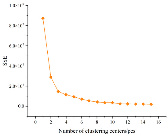 As illustrated in Figure 11, it is observed that with the increase in the number of clustering centers, the total sum of squared errors between the data samples and each cluster center continually decreases. The reduction in the total error value is most significant when the number of clustering centers changes from one to three. As the count shifts from three to fifteen, the total error still diminishes, but the rate of decrease noticeably slows down. Therefore, when the number of clusters is set to three, a drastic change in the total error value of the samples is noted, marking the ‘inflection point’ in the number of clustering centers. Consequently, the number of cluster centers is determined to be three.
