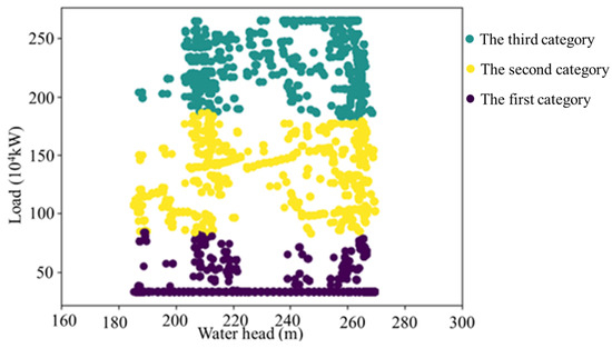 After determining the number of cluster centers, cluster analysis is performed on the collected data. The basic idea is that, according to the input form of the training data of the machine learning model, the collected data take the unit water head and external load as a sample, and then cluster.