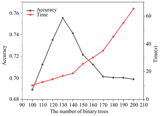 The figure shows that as the number of binary trees gradually increases, the model’s prediction accuracy first increases and then decreases, reaching its maximum value when the number of binary trees is 130. As the number of trees increases, the time for model calculation also rapidly increases. Comparatively, choosing a Random Forest with 130 binary trees is reasonable, achieving satisfactory prediction accuracy while requiring less time.