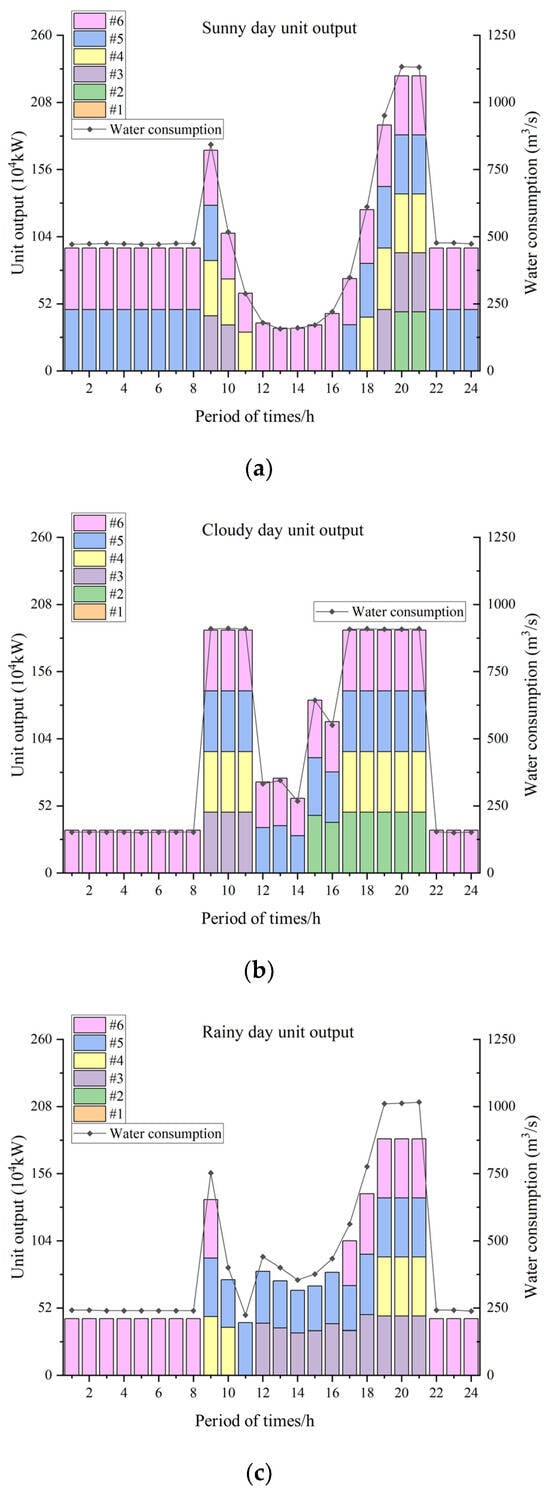 Figure 14 shown the load-distribution results of the hydropower station in June under three different scenarios: sunny, cloudy and rainy. On sunny days, the photovoltaic system provides a stable output during the power-generation phase, partially sharing the load borne by each unit of the station, resulting in a corresponding decrease in the total output of the station. On cloudy and rainy days, due to the variability and randomness of the photovoltaic output, the units also exhibit certain fluctuation cycles while compensating for the photovoltaic output.